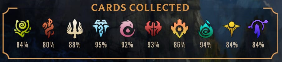 But Sera, why are you going on and on about this? Because Runeterra isn’t just avoiding the temptation to get easy money by abusing its players, it also offers a generous amount of free cards just for playing. I’m at 91.4% of a complete collection as of this writing, and I’ve spent less than $100 on the game in total, most of that on cosmetic items, and none of it on gambling. I will easily complete my collection without buying any more cards just by continuing to play the game, despite taking a break for 9 months out of the last 2 years it was live. That is a great feeling, and even if I stop playing this game one day or it stops being supported by Riot, at least I don’t have to lose hundreds or thousands of dollars in virtual items that were required purchases in order to be a competitive player. Starting this series of articles off talking about the economics of the game before I even get into what the game itself plays like may seem like an odd approach, but I cannot overstate how much the economy of Runeterra matters to me. I could not in good conscience recommend it to anyone if it contained gambling for cards, and as a principled person I will never knowlingly send someone into that trap.